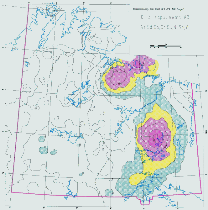 Результаты опробования мхов, отражающие степень загрязнения атмосферы пылью как промышленного происхождения (апатит-нефелиновые фабрики, карьеры, хвостохранилища, транспортные магистрали), так и природного (пыление нарушенных эрозией почв), картируют широкий ареал воздушного перемещения этих элементов в центральной части Мурманской области, с центром в районе Кировска и Апатитов. Слабая аномалия в районе Мурманска, вероятно, связана с перегрузкой апатит-нефелинового концентрата, а осложнения в структуре геохимического поля в районе Ковдор-Пиренга вызвана транспортировкой ковдорского концентрата по железной дороге. Локальная аномалия этих элементов фиксируется на севере Норвегии (по-в Варангер), что связано с пылением почв, сильно нарушенных выпасом оленей (кстати, впервые на эту проблему в Норвегии обратили внимание после проведения этих работ).