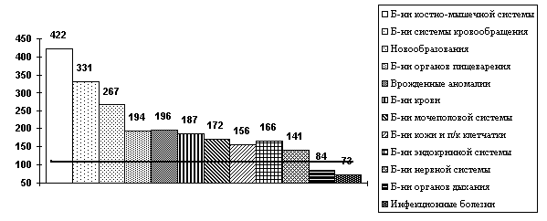 Наибольший темп роста болезненности среди детей Мурманской области за последние шесть лет отмечается по следующим классам и нозологическим формам болезней: болезни костно-мышечной системы (+4.2раза), язвенная болезнь желудка и 12-перстной кишки (+4.3раза), нефриты и нефрозы (+3.9 раза), болезни системы кровообращения (+3.3раза), новообразования (+2.7 раза), сахарный диабет (+2.3 раза), бронхиальная астма (2.4 раза), анемия (+2.4 раза), врожденные аномалии (+196%) болезни органов пищеварения (+194%), болезни крови и кроветворных тканей (187%), болезни мочеполовой системы (+172%).