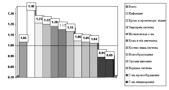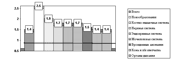 Регистрируется рост заболеваемости детей первого года жизни общий уровень которой за пятилетний период с 1993 по 1997 год увеличился на 13.2%. Из 10 сопоставимых за этот период классов заболеваний достоверный рост распространенности патологии выявлен по 8, в том числе: