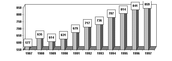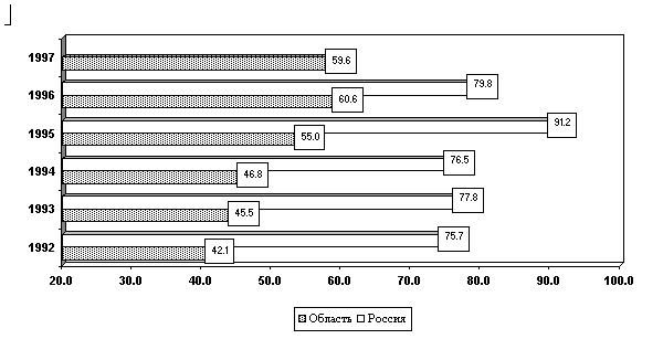 Анализ динамики первичной инвалидности населения Мурманской области установил негативную тенденцию к ее росту. За период с 1992 года по 1997 год показатель первичной инвалидности увеличился на 41.6 %. В среднем по Российской Федерации прирост первичной инвалидности за период с 1992 по 1996 год составил 5.4%. Столь значительная разница в темпах прироста первичной инвалидности в Мурманской области и по России в целом за последние годы привела к уменьшению различий среднероссийского и среднеобластного показателей. Так, если в 1992 году показатель по Мурманской области составлял 55.6% от среднероссийского, то в 1996 году - 75.9%. Более низкие показатели первичной инвалидности в Мурманской области по сравнению со среднероссийскими обусловлены в первую очередь различиями в возрастной структуре населения области и России в целом (известно, что уровень инвалидизации возрастает по мере увеличения возраста). Среди лиц, впервые признанных инвалидами в 1997 году, лица пенсионного возраста в Мурманской области составили 50.2 %. Динамика показателя первичной инвалидности представлена на рисунке.